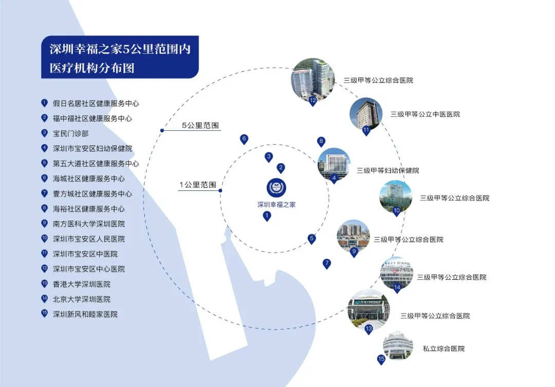 社区3公里范围内生活配套丰富,“宝安壹方城”“大仟里”“前海山姆会员店”等大型商超近在咫尺,购物便利。医疗资源同样完善,5公里内分布五家三甲医院、七家社康机构,为日常急诊转诊、康复跟进等多方面需求提供了便捷可靠的保障。