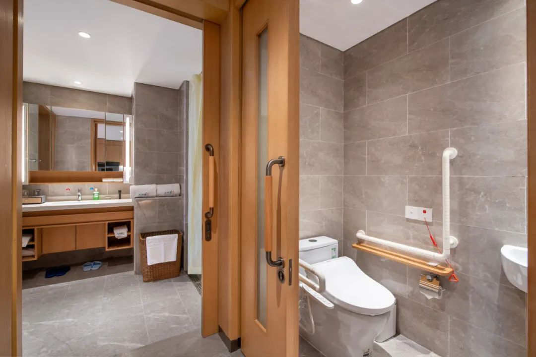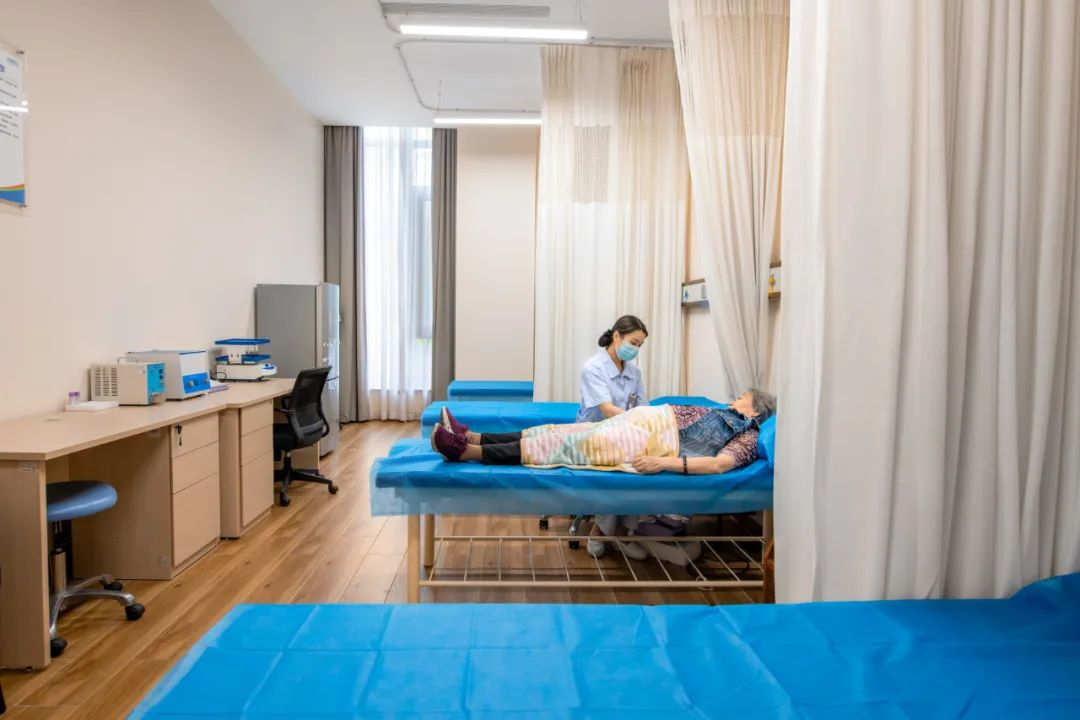 全社区无障碍通道,电梯双开门设计(容纳担架)。公共区域盲道、轮椅专用坡道,护理区配备电动护理床、移位机。