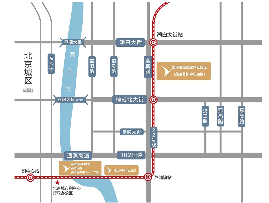 皓月雅苑居家养老社区位于北京东燕郊中央活力区,紧邻京秦高速,距地铁22号线神威大街站700米、潮白大街站1300米,乘地铁9分钟就可到达北京城市副中心,30分钟可到达东大桥地铁站,地理位置优越,公路地铁交通便捷发达。